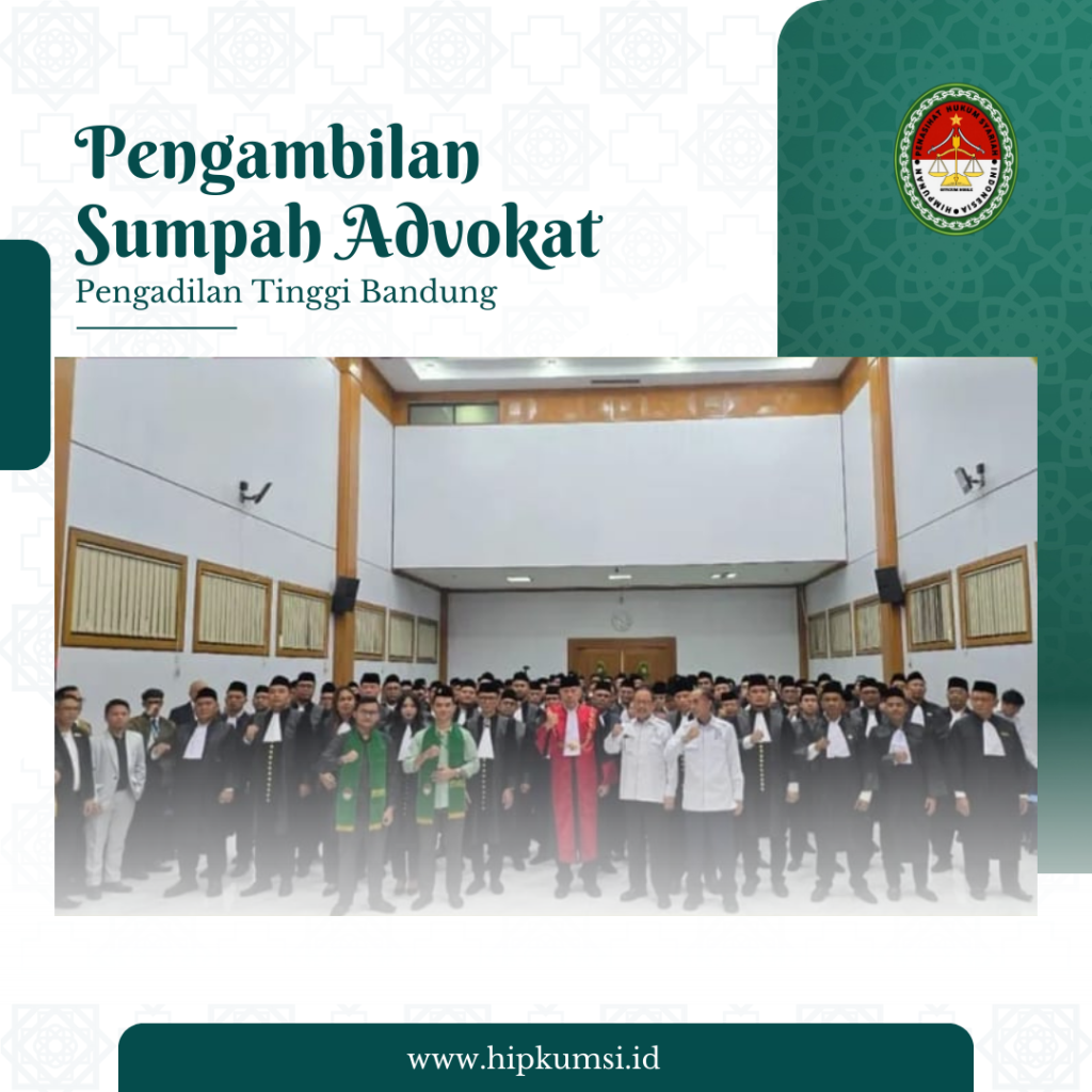 Hipkumsi.id | Bandung, Pengadilan Tinggi Jawa Barat Lantik Advokat Himpunan Penasihat Hukum Syariah Indonesia (HIPKUMSI) pada pengadilan tinggi Jawa Barat 30 Oktober 2025, Acara yang berlangsung Khitmat dan penuh haru ini menjadi semangat baru para advokat yang dilantik. Advokat hipkumsi sebanyak 24 Advokat resmi hadir dalam pengambilan sumpah / janji advokat pada pengangkatan Angkatan VI […]